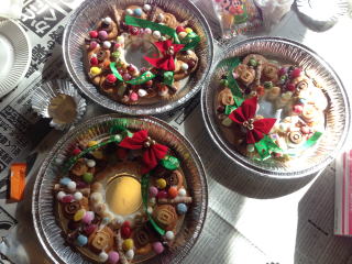 | 《クリスマス特別教室/お菓子のクリスマス・リースを作ろう!》2015.12 身近なお菓子でかわいいクリスマス・リースを作りました! 粉砂糖で作ったアイシングがボンドの代わりです。 飾ったあとはおいしく食べられますよ♪ アトリエ以外のたくさんのお子さんにもご参加いただきました。 |