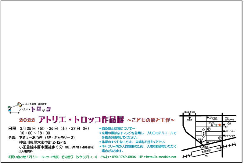 | お問い合わせ/ 〒243-0031 神奈川県厚木市戸室4-3-8 でんわ*090-1769-0836 メール*yes@a-torokko.net HP*http://a-torokko.net アトリエ・トロッコ代表) 竹内智子(タケウチトモコ) |