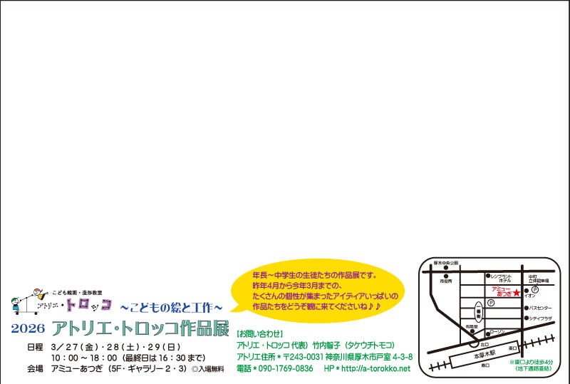 | お問い合わせ/ 〒243-0031 神奈川県厚木市戸室4-3-8 でんわ*090-1769-0836 メール*yes@a-torokko.net HP*http://a-torokko.net アトリエ・トロッコ代表) 竹内智子(タケウチトモコ) |